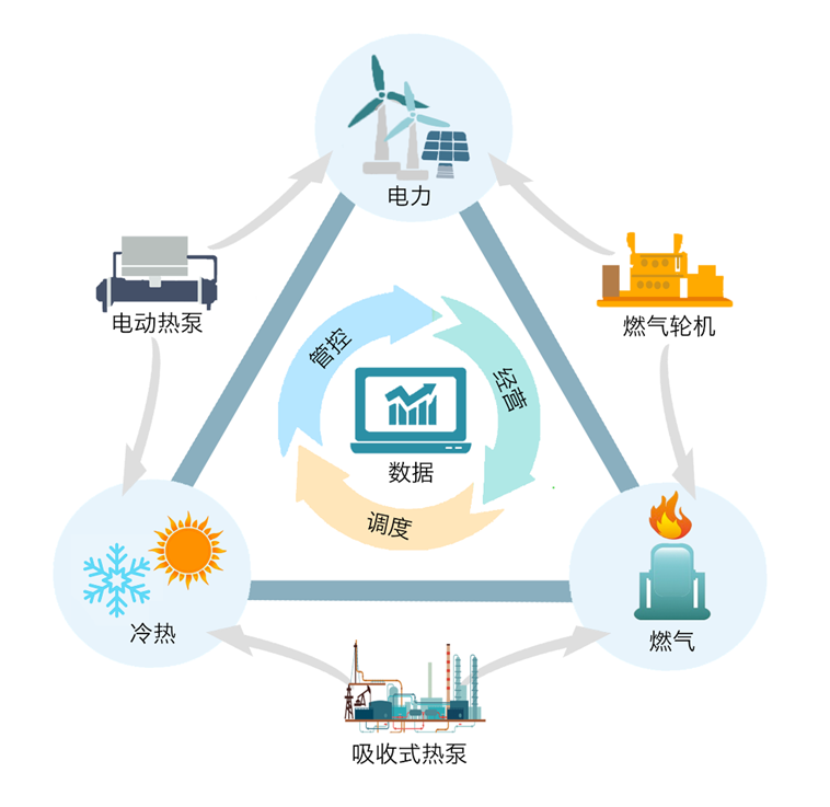 能源互联网是新能源技术、智能电网技术、信息技术的集成创新,最突出的技术特征有两个。一是电力、冷热和燃气的供应方式多能互补,如下图所示,电力和冷热转化的主要装置是电动热泵,燃气和电力转化的主要装置是燃气轮机,而燃气和冷热转化的主要装置是吸收式热泵,能源供应和转换过程的优化和装置的控制调节的基础是数据,能源管控平台是能源互联网的关键支撑。能源管控平台的工作基础,实际上是系统投入使用后的运行数据和规划设计依照的负荷数据之间的实时比对和修正。